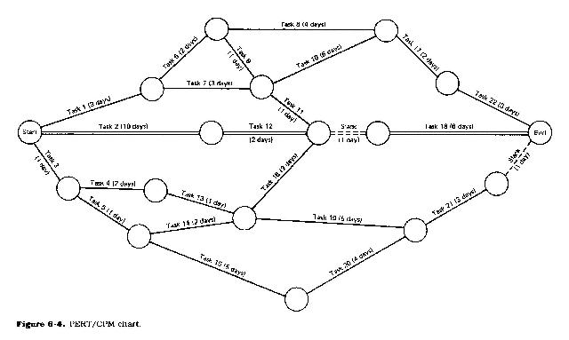 A PERT chart (Figure 6.2) may have multiple parallel or interconnecting networks of tasks. Where the project has scheduled milestones, checkpoints, or review points (all of which are highly recommended in any project schedule), the PERT chart will note that all tasks up to that point terminate at the review node.