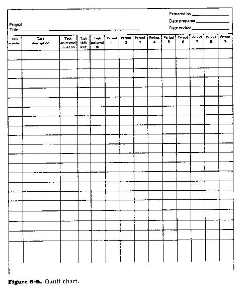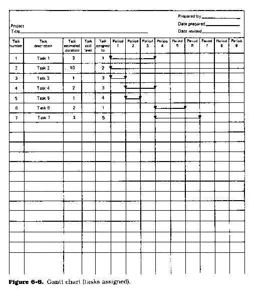 A Gantt chart (Figure 6.5) is a matrix which lists on the vertical axis all tasks to be performed. Each row contains a single task identification which usually consists of a task number and name. The horizontal axis is headed by columns indicating estimated task duration, skill level needed to perform the task, person assigned to the task, followed by one column for each period in the project's duration. Each period may be expressed in hours, days, weeks, months, etc. In some cases it may be necessary to label the period columns as period 1, period 2, and so on.