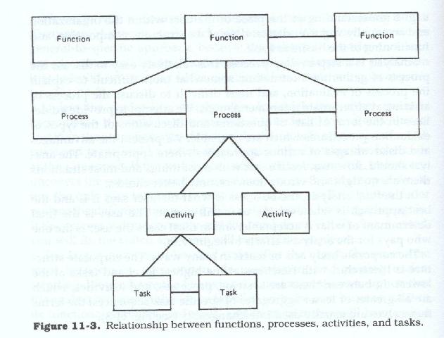 The corporate body acts or reacts in many ways. The corporate structure is hierarchical with functions being at the highest level and tasks being at the lowest. In between these are systems, processes, and activities, which are all greater or lesser aggregates of specific task sequences. The terms themselves are usually used interchangeably. (See Figure 11.3.)